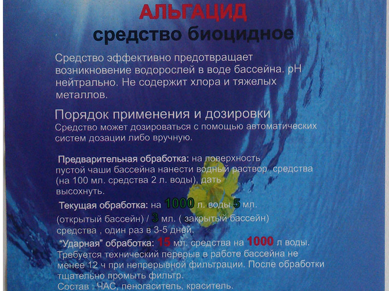Предварительная обработка: 250 мл. Альгацида развести в 5.0 литрах воды, обработать дно и стены бассейна, дать высохнуть.